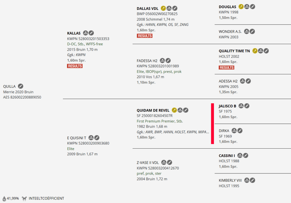 Even over de Genen van Quilla: Moeder E Quisinie T is elite, met 8’en voor reflexen en instelling tijdens de merrietest. Ze combineert in haar pedigree de waardevolle internationale sport- en fokkerijgrootheden Quidam de Revel en Cassini I. Quilla heeft een halfzus ( v Numero Uno) die 1.40 is geklasseerd. Grootmoeder Z-Vase II VDL leverde al een 1.30m-springpaard en is zelf een halfzus van de internationale 1.60/1.50m-springpaarden Seremonie VDL (v.Cento) en A Quibelle RR (v.Quidam de Revel). Vader Kallas imponeert met zijn springkwaliteiten, galop en rijdbaarheid en is 1.60 geklasseerd. Hij maakte bovendien een hele goede indruk met zijn nakomelingen. Quilla komt uit zijn tweede jaargang.