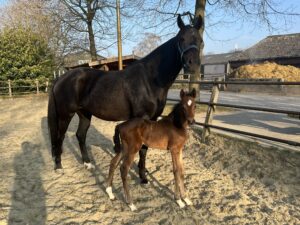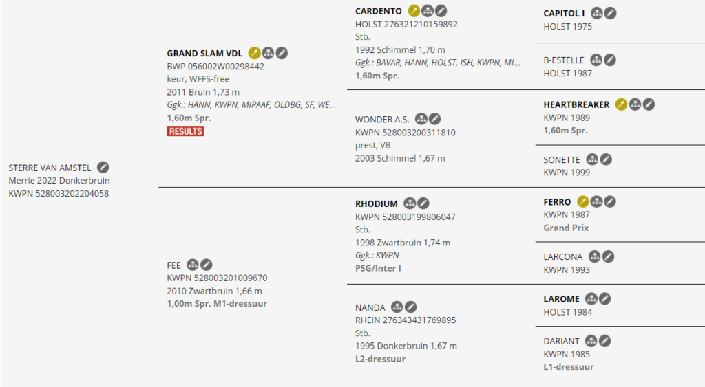 Tijdens de hengstenshow 2019 in Nuenen bij Piet Kuypers werd GrandSlam getoond, toen 8 jaar oud. ( zie foto). “Nou als we een keer de gelegenheid krijgen om met Fee een veulentje te fokken , dan wordt dit de vader van t veulentje!” Die kans kwam in 2021. Sterre heeft ons vanaf dag 1 verbaasd over haar atletisch vermogen, wendbaarheid en snelheid. Ook sprong ze, 14 dagen oud , zo uit stilstand over de omheining van de bakrand. Ook bij anderen stalgenoten viel ze al op , door haar nieuwsgierig karaktertje.